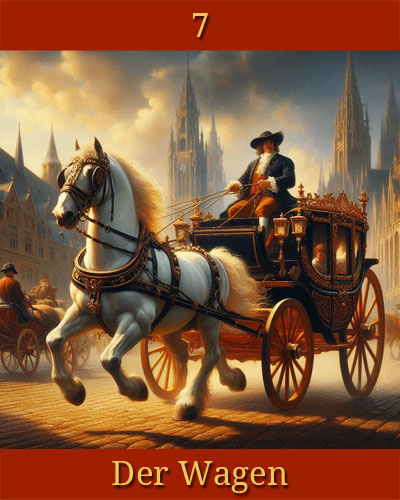 Allgemein: Der Wagen steht für Entschlossenheit, Fortschritt und das Streben nach Zielen. Er symbolisiert den Mut, neue Wege zu beschreiten und Herausforderungen zu überwinden. Der Wagen ist ein Symbol für Bewegung und den Triumph des Willens.